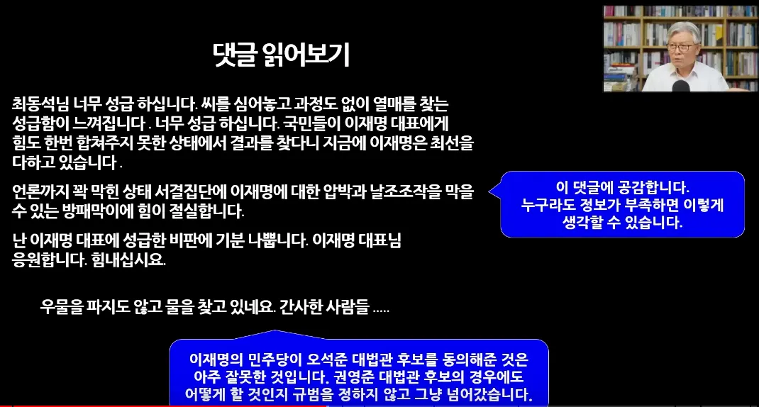 댓글 작성자는 소장님이 이재명 대표를 지지하지 않는다고 말합니다.