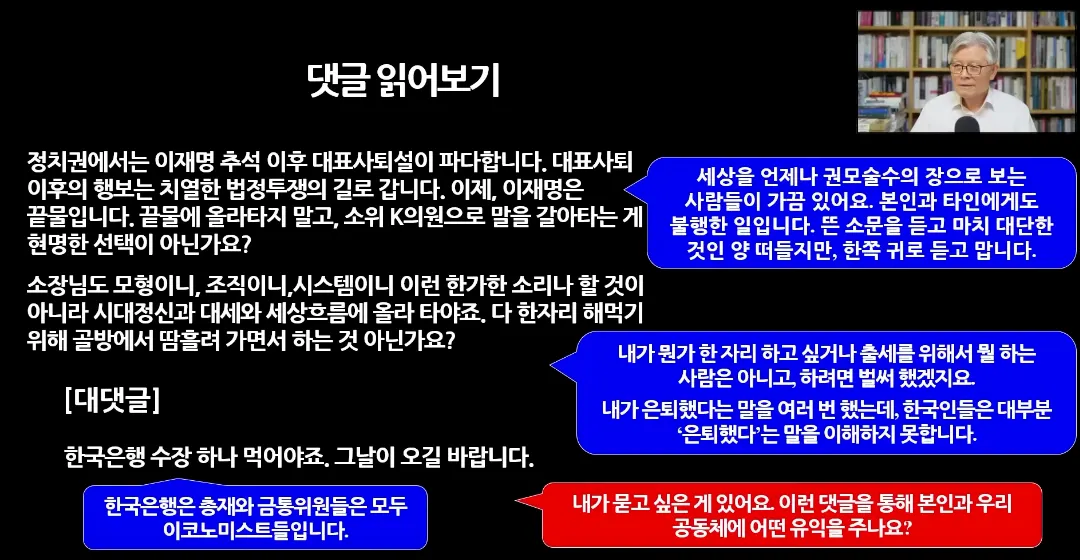 댓글 작성자는 소장님이 한국은행 수장을 해먹으려고 골방에서 땀 흘리며 공부하고 있다고 주장합니다.
