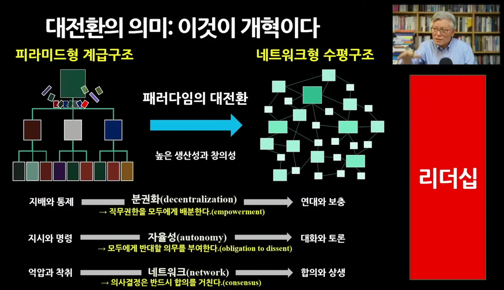 이 구조에서 벗어나기 위해서는 네트워크형 수평구조로 변해야 한다.