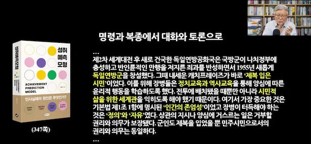 군인과 시민의 관계에 대한 주제와 군인은 제복을 입은 시민이며, 양심에 따른 윤리적 행동을 학습해야 한다는 소주제가 있음.