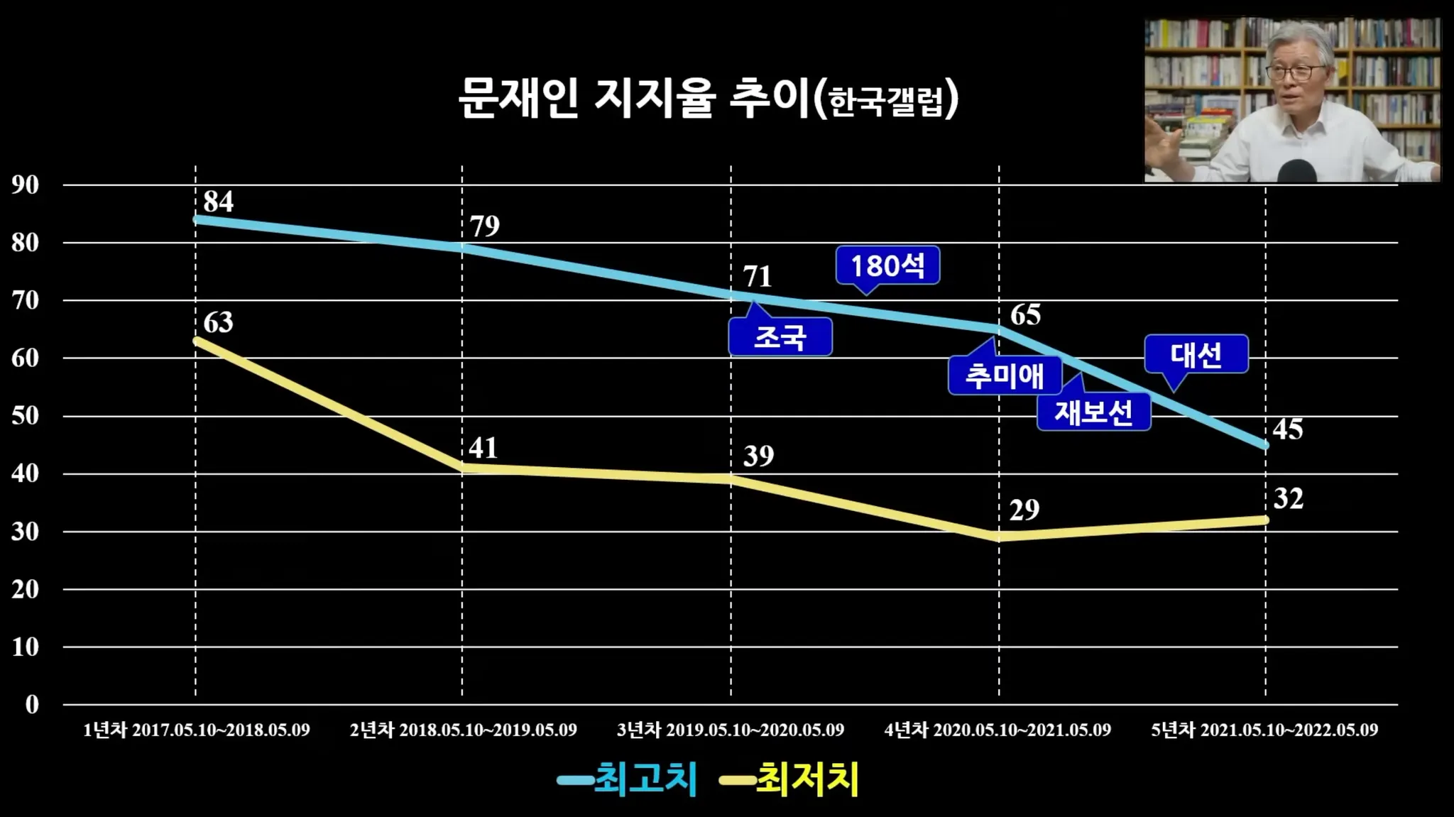 문재인의 지지율 추이를 보면 84%에서 45%까지 떨어진 여론조사도 있음