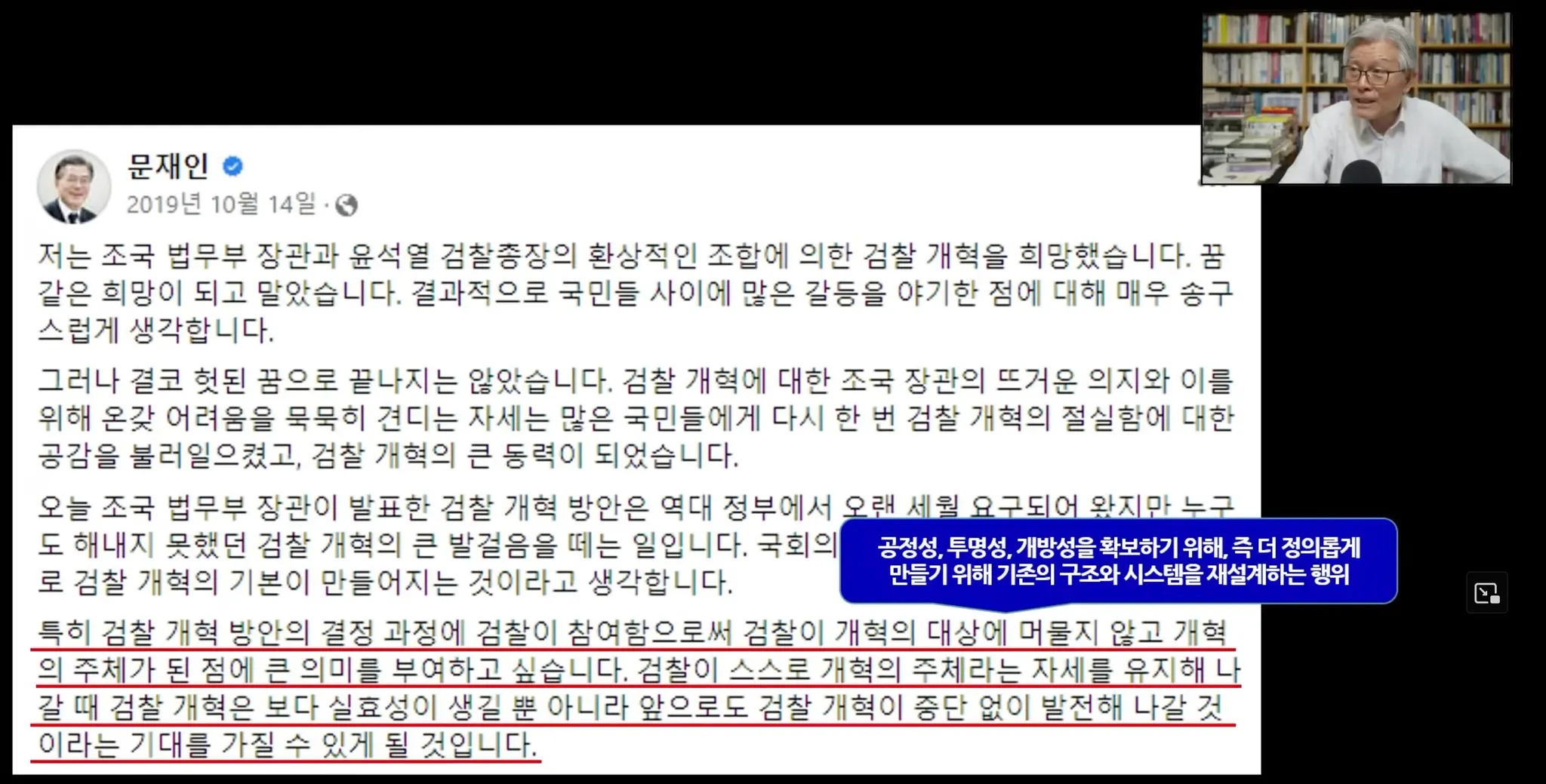 특히 검찰 개혁 방안의 맨 밑에 달라. 문재인의 페이스북에 쓴 거예요. 맨 아까 대담 때도