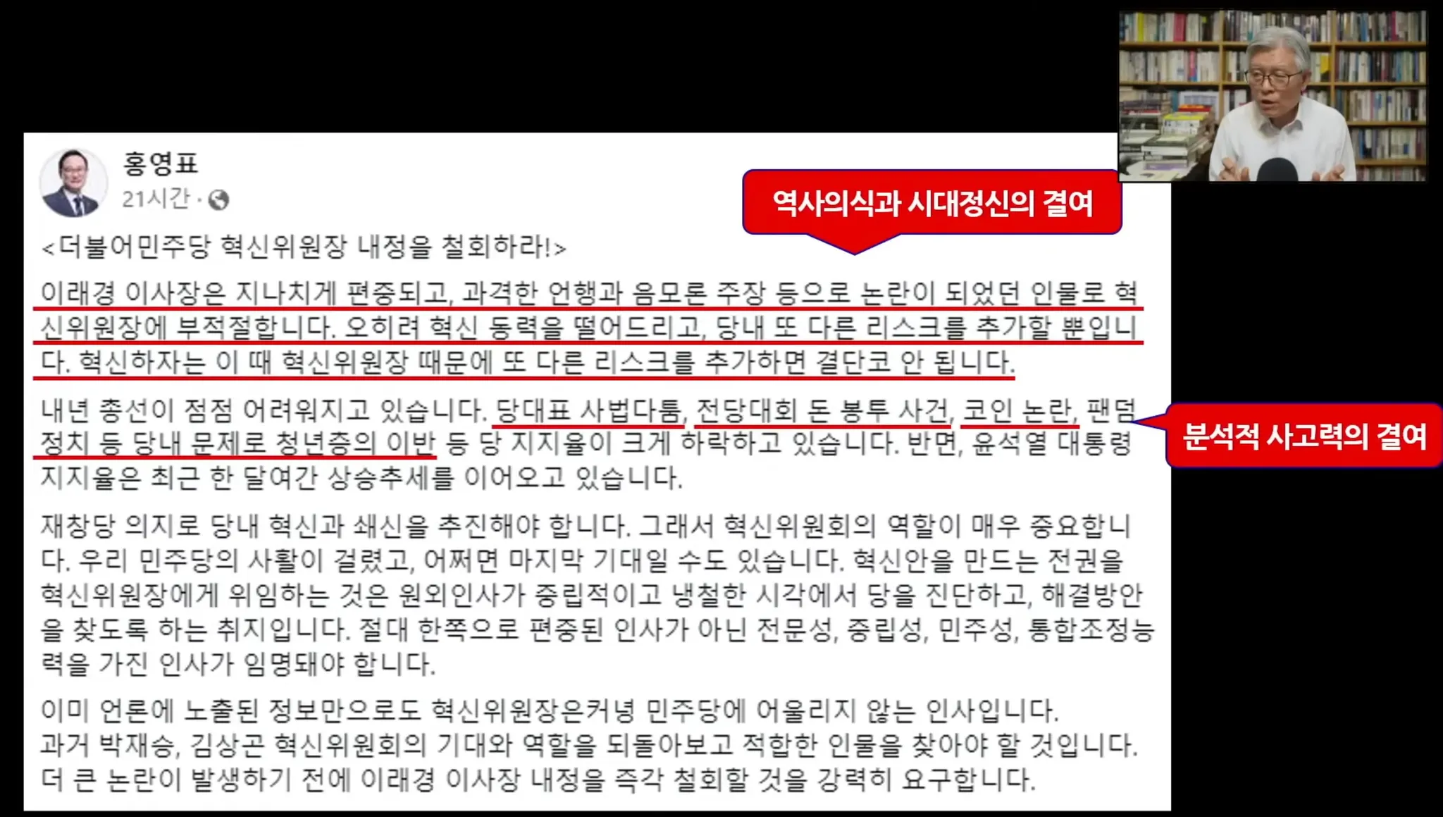 이재명은 지난 10년에 누구도 하지 못한 일을 이룩했다고 그래서 내가 이재명을 이 일꾼으로 시켜야 된다. 이렇게 말하는 거예요. 다른 얘기가 아니에요. 역사의식과 시대정신이 있는 사람만이 사회적 성취를 이루어낼 수 있어요. 합치니 무슨 법치니 이런 개소리를 하면 안 되는 겁니다.