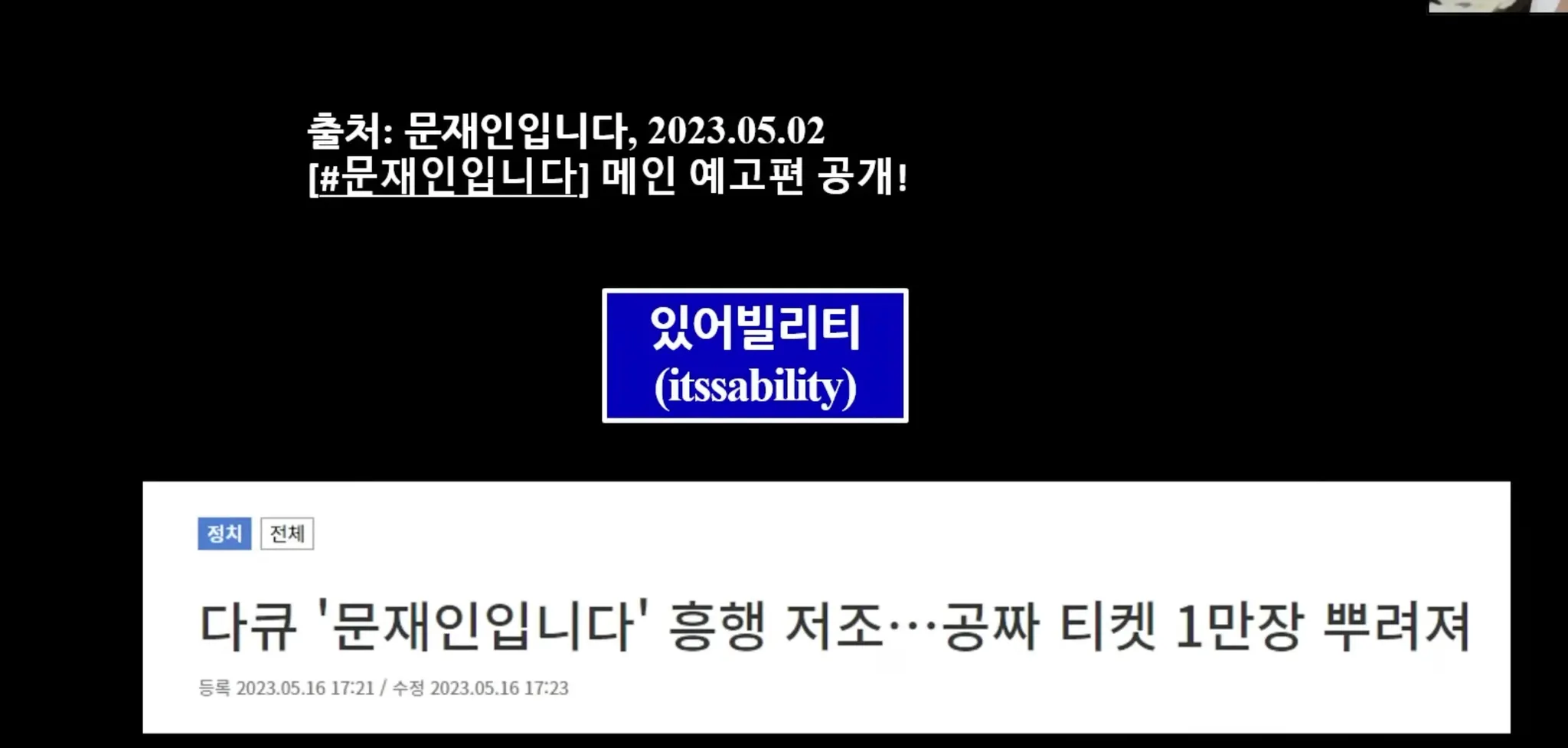 그런데 전국에 다 그래서 185만 명이 받고 해외에서도 이게 나가가지고 상당히 많은 돈을 벌었어요. 그래서 그 감독이 다시 다큐 문재인입니다를 만들었거든요. 전주 무슨 영화 제가 거기서 1억 원까지도 이 펀딩을 받았어 했는데 안 봅니다. 사람들이 지금 10만 명 총 관객 수가 10만 명 조금 넘었어요. 한 달이 넘는데도 벌써 이 기사가 5월 11일 날 이 영화가 개봉이 됐는데 5월 16일 일주일이 지났는데 벌써 관객이 없어요. 흥행이 저조해요. 한 달이 지났는데 10만 관객 제가 앞에서 이 얘기를 했습니다.