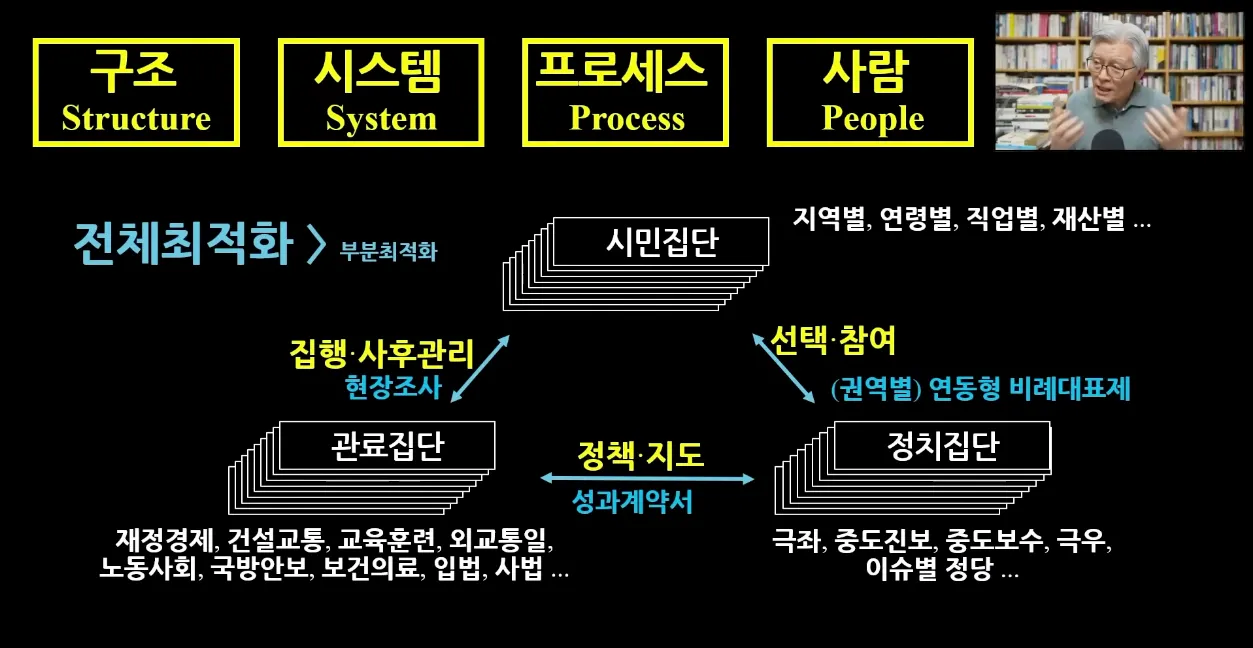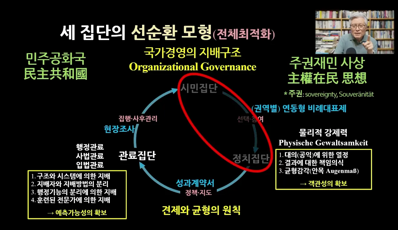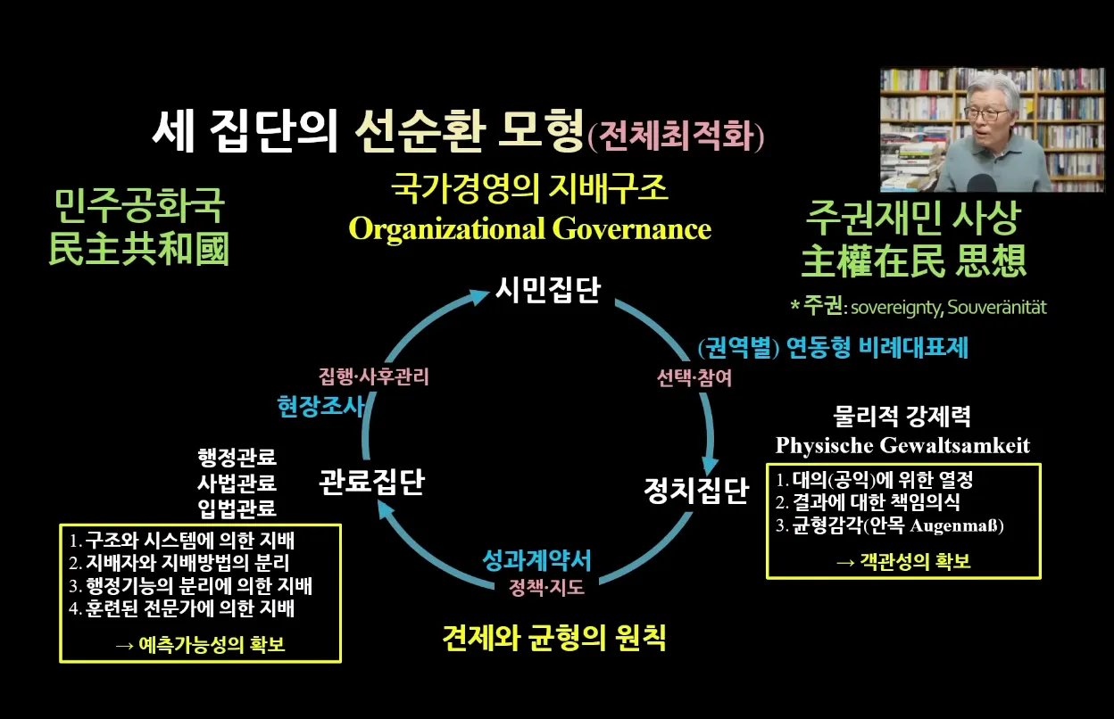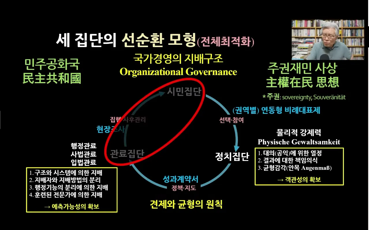 정치 집단은 관료 집단을 장악하여 시민 집단에게 봉사해야 하며, 이를 통해 선순환 구조를 구축해야 한다.