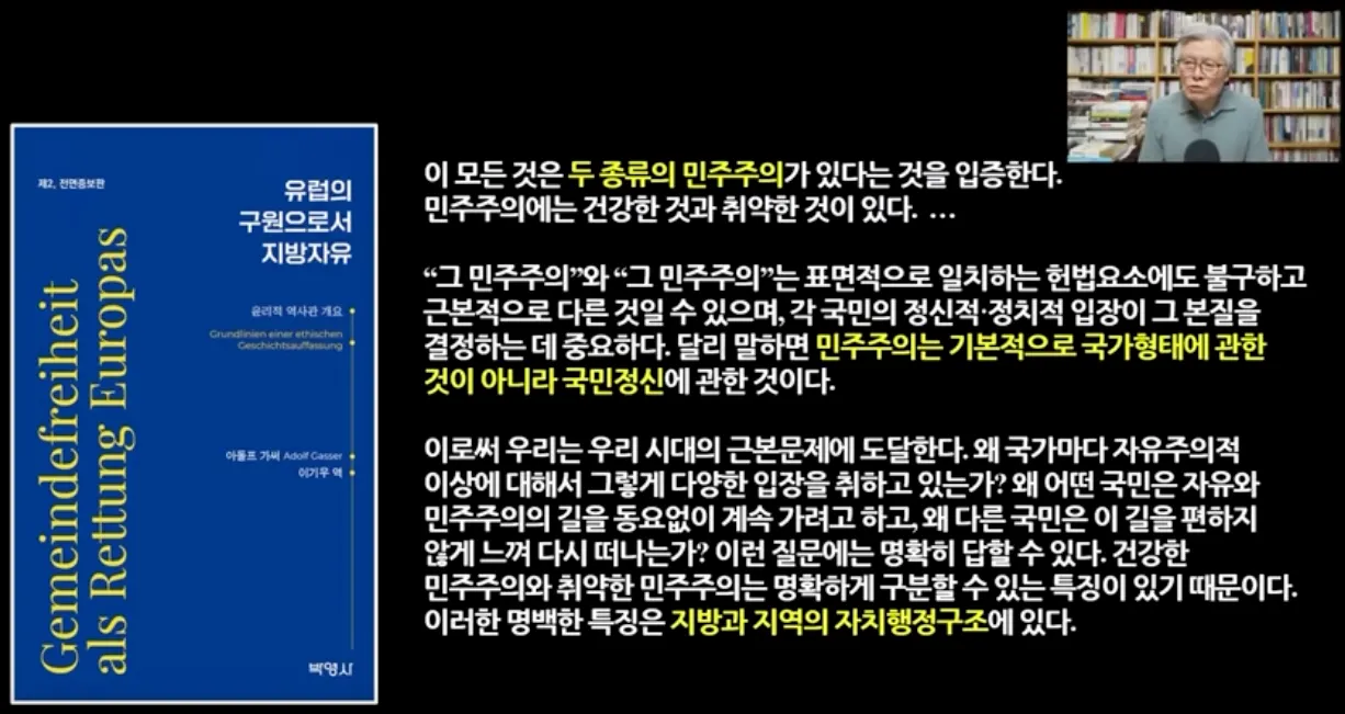 건강한 민주주의는 국민 정신에 관한 것이며, 지방자치가 중요하다.