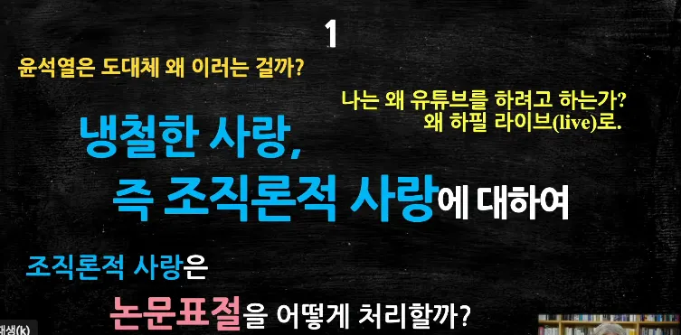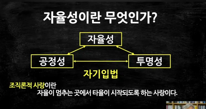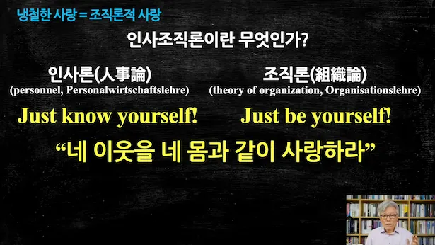 칸트가 말했던 인간이성의, 인간이성은 지성이 아니라 이성, 독일인들의 구분법에 의해서, '사고하는 힘'. 그 '사고하는 힘'은 능력인데 능력이 인간의 인간의 이성은 능력인데 그 능력은 두 가지 기능을 가지고 있습니다. 하나는 자기 초월 능력이 있는 거고 또 하나는 자기 입법 능력이 있는 거예요. 자기 입법 기능을 가지고 있을 때 자기 입법 기능이라면 내가 스스로 도덕률을 내 안에 만들어서 입법을 한 거죠. 법을 만들어서 자기만 지킬 수 있는 헌법을 만들어서 내가 스스로 내가 만든 법에 나의 몸과 마음을 복종시키는 거예요. 그것을 자기 입법 능력이라고 해요. 인간은 자기 입법 능력을 가지고 있어요. 그래서 자기 입법 능력을 가지고 있는 사람들이 모여서 대학을 구성 하고 기업을 구성하고 정부를 구성하고 가정을 구성하는 거예요. 그리고 자기 입법 능력이 있기 때문에 우리가 서로 사랑할 수 있게 되는 거죠. 왜냐하면 모든 각자의 자기 입법이 합쳐지면 그것이 보편입법이 되는 거잖아요. 우리 사회의 구조와 시스템과 프로세스를 유지하는 공동의 입법이 되는 거잖아요. 보편입법이 되는 거잖아요. 그래서 자기 입법이 중요한 거예요. 그래서 자기 인식이 중요한 거고 그래서 자기가 되라는 just be yourself just know yourself 이 두 가지 기능이 인사 조직론에서 아주 기본 바탕을 이루고 있다는 사실을 우리가 명심해야 됩니다. 그래서 조직론적 사랑이란 뭐냐, '자율이 멈추는 곳에서 타율이 시작되는 사랑'이에요. 알았죠. 조직론적 사랑이랑 냉철한 사랑 이란 뭐냐 '자율이 멈추는 곳에서 타율이 시작되는 사랑'이에요. 그래서 국민대는 철저하게 응징 해줘야 됩니다. 자율이 멈췄거든요. 공정성이 훼손됐고 투명성도 없어요. 그건 자율성이 아닙니다.