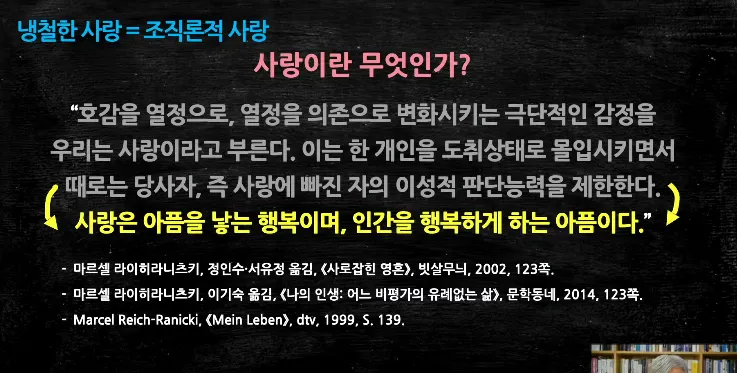 또한, 사랑에 대한 이해와 그 표현에 대해 개인적인 해석과 마르셀 라이히니츠키의 견해를 통해 사랑이 아픔을 낳는 행복이며, 인간을 행복하게 하는 아픔이라는 주장을 제시한다. 이는 이성적 사랑, 조직론적 사랑, 냉철한 사랑이 될 수 있다.
