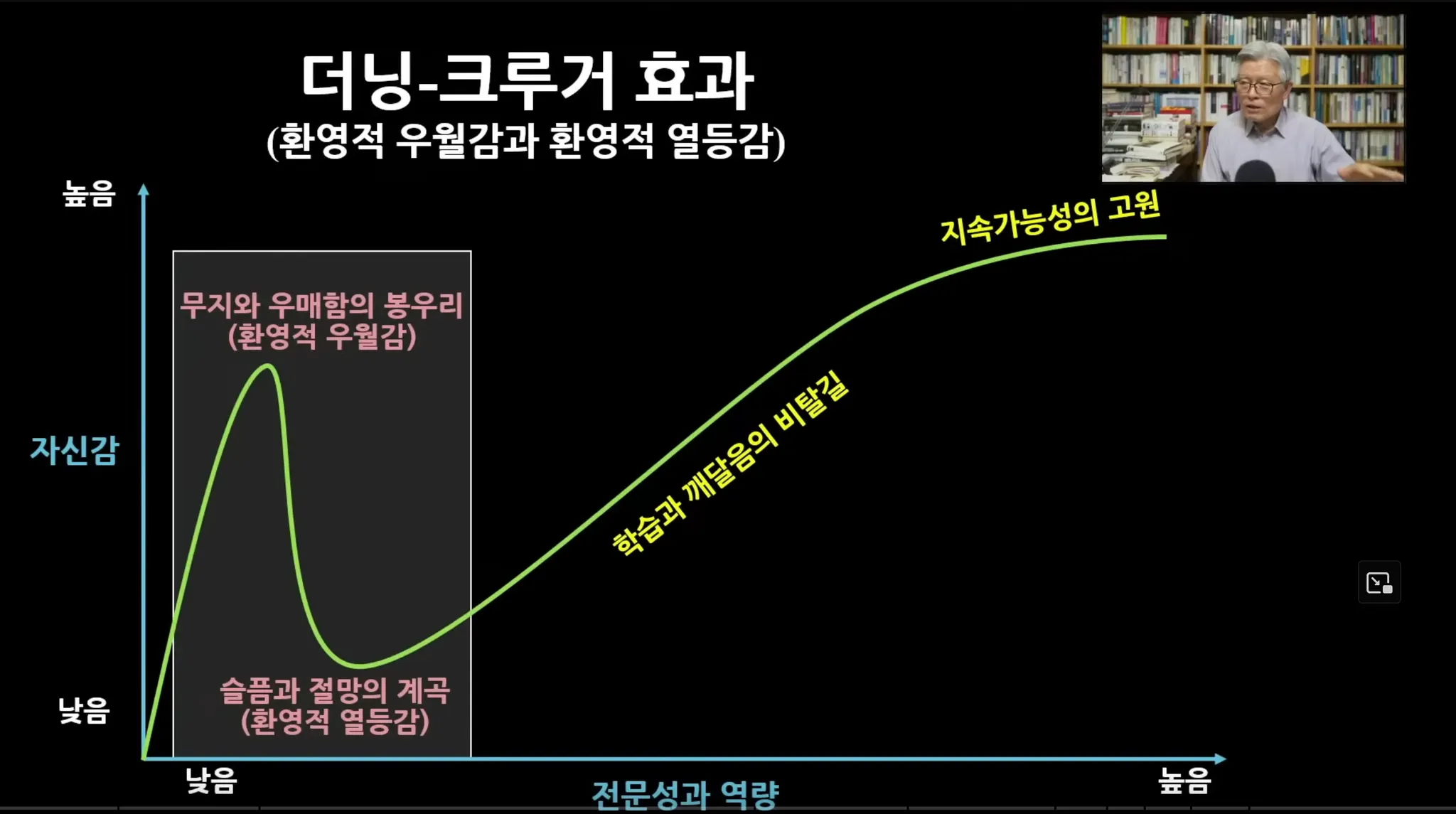 이 사람들은 대부분이 사는 사람들이 먹고사니즘 때문에 일상의 정치적 사건에 관심이 없는 그런 세계로 들어가잖아요. 그래서 윤석열 홍석현 문재인 이낙연은 저 봉우리에 있는 사람들이죠. 무지와 우메함의 봉우리라고 이름을 붙였는데 바로 저 환영적 우월감에 있는 봉우리 저기에 사랑하는 사람이라고 제가 분류했습니다.