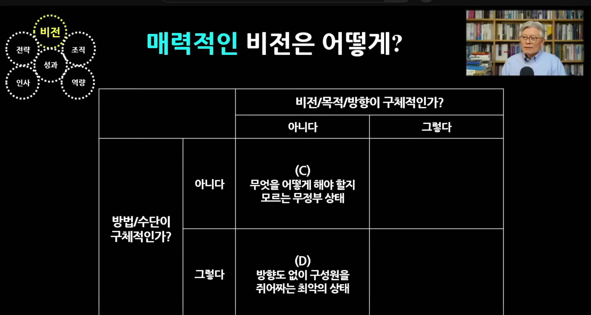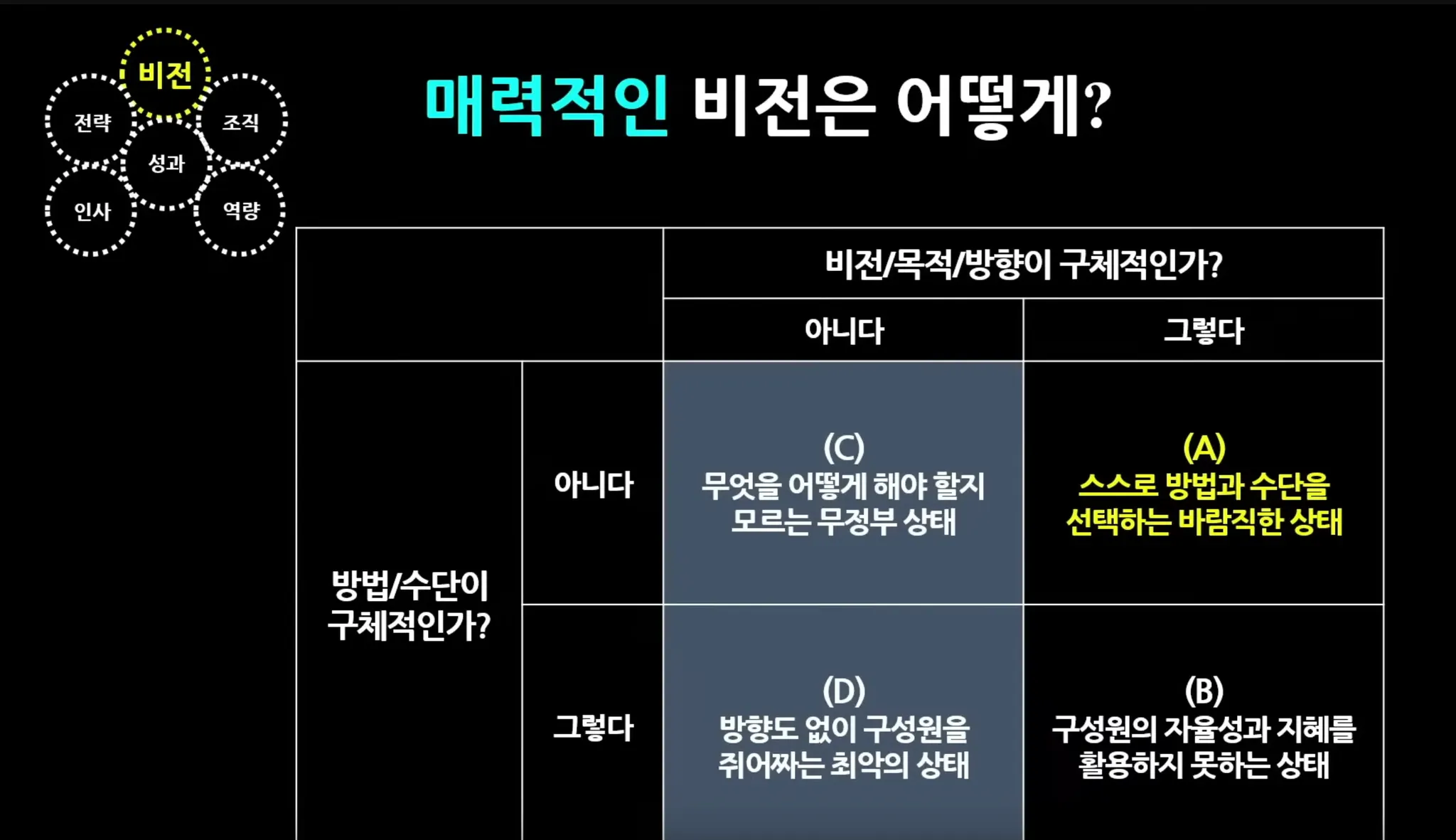 사분면으로 나눠 비전 목적 방향과 수단 방법의 구체성을 분석