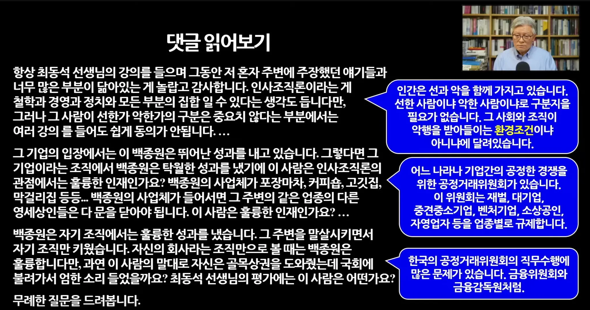 음식점 사업가인 백종원은 자신의 조직만 성장시키고 골목 상권을 도와주지 않았다.