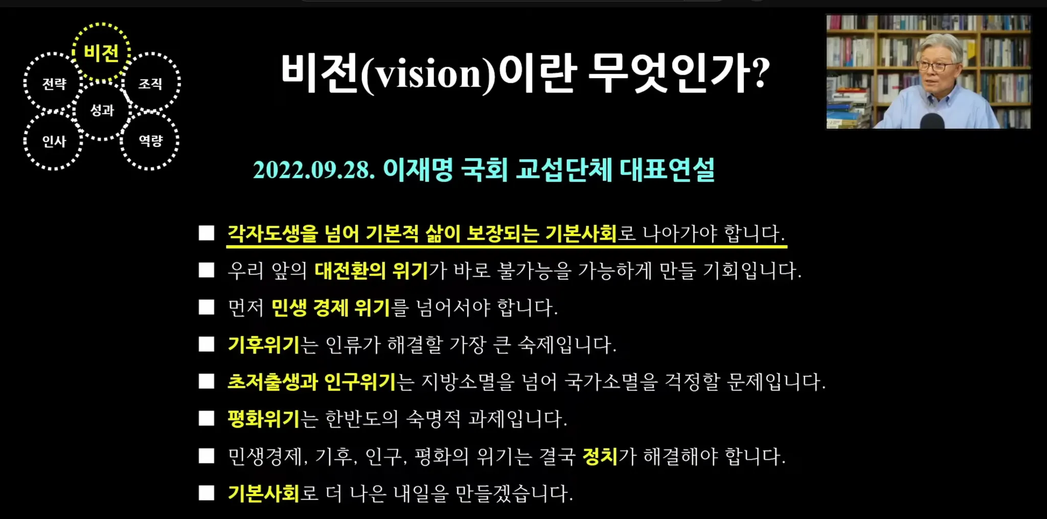 민주당 대표 이재명에게 하고 싶은 얘기와 민주당 전체 의원들과 구성원들에게 하고 싶은 얘기가 있다. 경영학자로서 이재명에게 인사조직 분야를 전공한 경험을 공유하려고 한다. 경험을 바탕으로 책을 내는 것은 좋지만 논문 쓰는 것은 싫어한다. 그렇지만 실무에서 제가 배운 것을 적용시켜 컨설팅하고 사람들을 만나며 경험을 공유해왔다. 제 지식과 경험을 여러분과 공유할 수 있어서 행복하다. 허나 선생님들의 염려로 인해 체력 관리에 좀 더 신경 쓰며 계속 할 수 있게 되었다. 처음에 1년 하려고 생각했지만 지금은 이미 1년이 지났다.