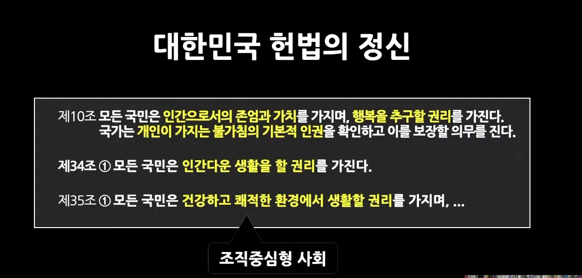 대한민국 헌법 : 모든 국민은 인간으로서 존엄과 가치를 가지며 행복을 추구할 권리를 가짐